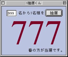 i抽選くんは最愛のiMacを創る会の1000000アクセスプレゼントの抽選を行うために作成されました。電子サイコロの高機能版と思っていただければほぼ、正しいでしょう。人数を入力すると、その中から、ランダムで1名の当選者を選ぶことができます。REALbasicをお使いの方は、ソースをダウンロードしてください。 Mac OS版 : ichusen.lzh Windows版: ichusen.zip (232kB) REALbasicソース:ichusen_src.lzh (4kB) |